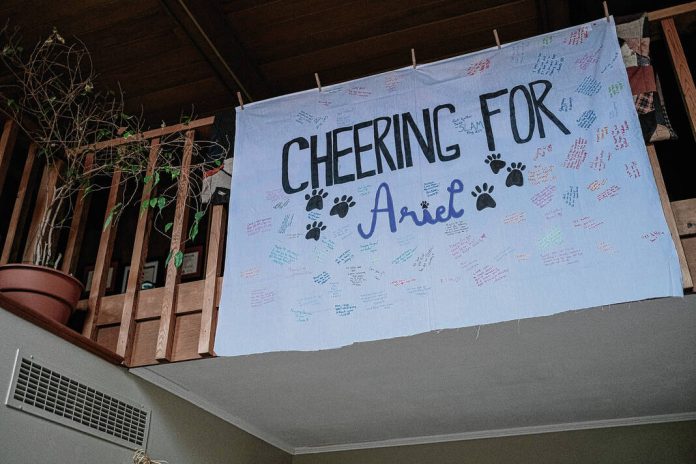A sheet with messages of support for Columbus North cheerleader Ariel Roberts hangs from a railing at her parent’s home in Columbus, Ind., Thursday, Feb. 17, 2022. Roberts was diagnosed with inoperable embryonal brain tumor in January. She is set undergo months of radiation and chemo therapy to treat the tumor. Mike Wolanin | The Republic