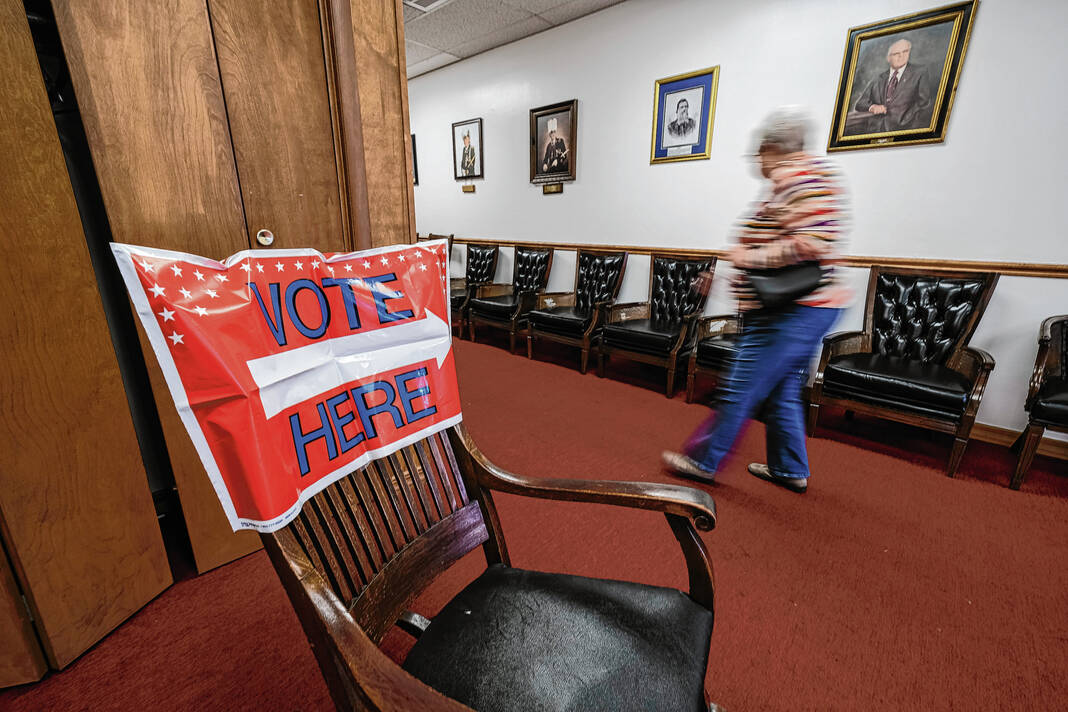 Mike Wolanin | The Republic A vote here sign points to way to the entrance to the vote center inside St. John’s Masonic Lodge on Election Day in Columbus, Ind., Tuesday, Nov. 7, 2023.
