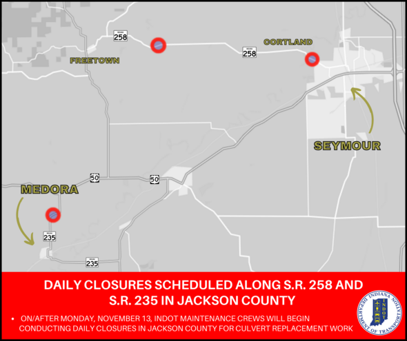 - Monday, Nov. 13 (weather permitting): State Road 258 at mile marker 10 between Seymour and Cortland from approximately 8:30 a.m. to 3 p.m.