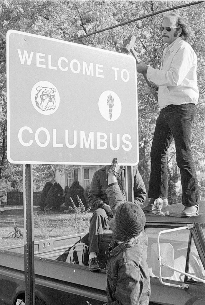 Jack Conner, director of city traffic affairs, stood on the roof of a truck to help install one of five new signs featuring the emblems of the city’s two high schools, welcoming visitors coming into Columbus from the east, west, north and south in 1973.