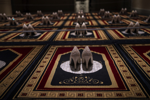 “Silence,” an installation by French Algerian artist Zoulikha Bouabdellah that displays 30 pairs of stiletto heels on the same number of Islamic prayer rugs, dominates the center of a room. Bouabdellah agreed to have her work removed from a museum in Clichy, France, after the 2015 attacks in Paris against the staff of the Charlie Hebdo satirical newspaper, which had published cartoons of the Prophet Muhammad.