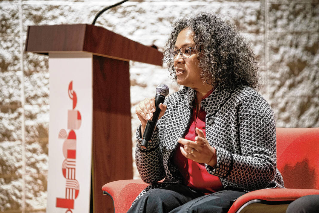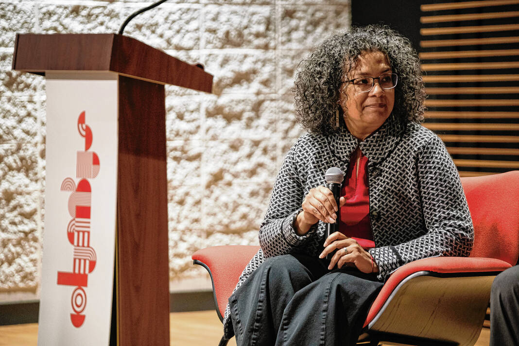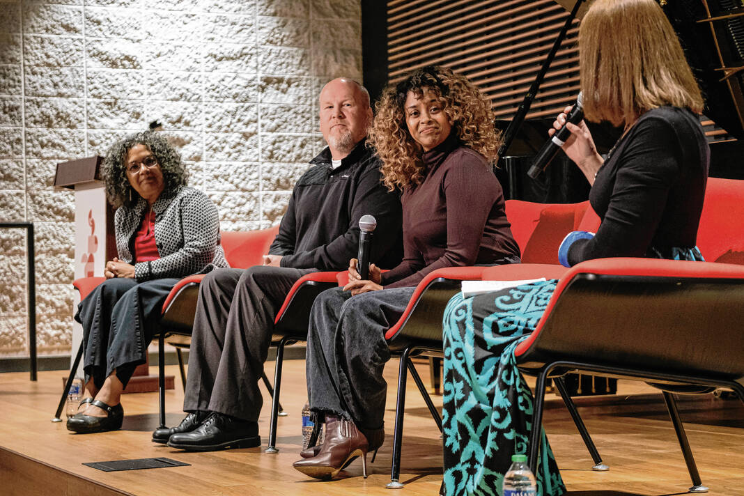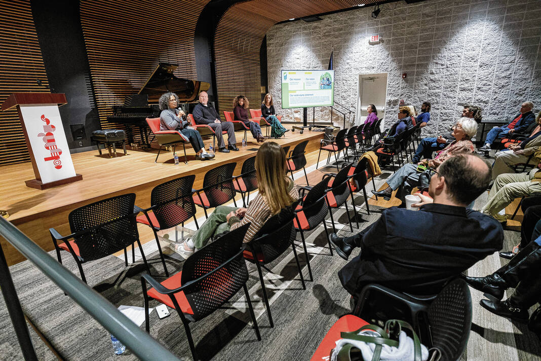 Mike Wolanin | The Republic Phyllis Viola Boyd, from left, director of Indy Parks and Recreation, Mark Jones, director of Columbus Parks and Recreation, Sara Zewde, founding principal of Studio Zewde, and Laura Garrett, director of partnerships for Landmark Columbus, take part in an Exhibit Columbus Miller Prize winner panel discussion about Studio Zewde’s installation Echoes of the Hill at Helen Haddad Hall in Columbus, Ind., Saturday, Nov. 18, 2023.