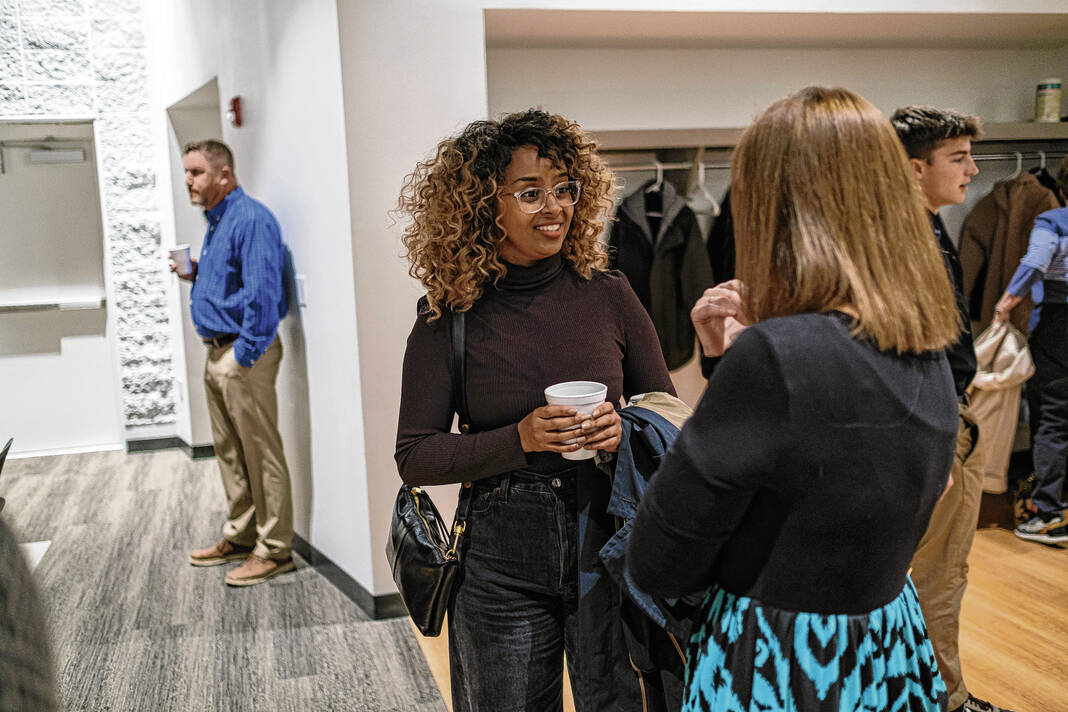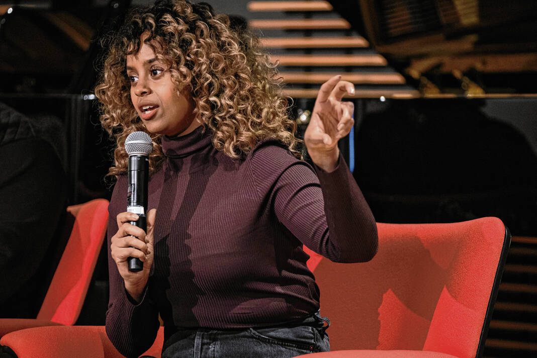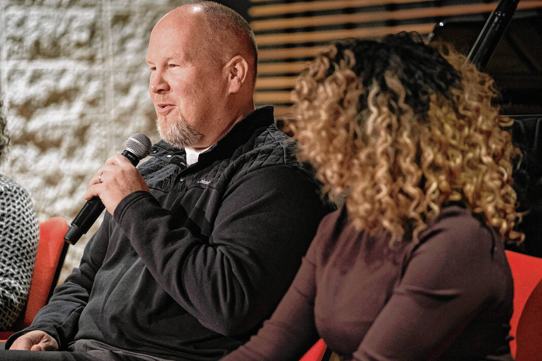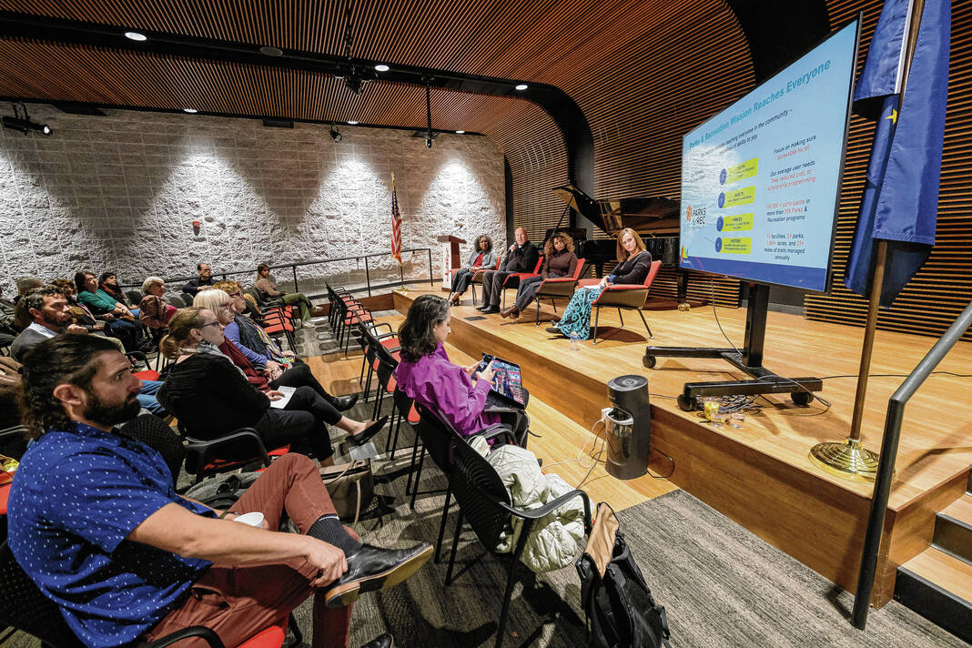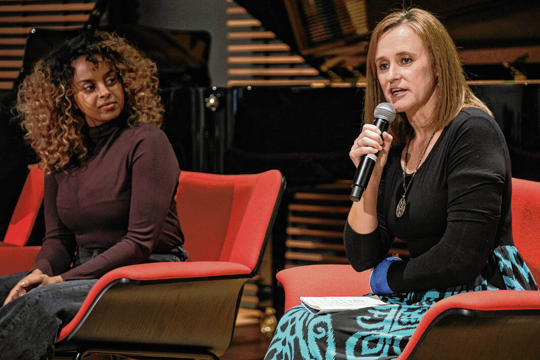 Mike Wolanin | The Republic Phyllis Viola Boyd, from left, director of Indy Parks and Recreation, Mark Jones, director of Columbus Parks and Recreation, Sara Zewde, founding principal of Studio Zewde, and Laura Garrett, director of partnerships for Landmark Columbus, take part in an Exhibit Columbus Miller Prize winner panel discussion about Studio Zewde’s installation Echoes of the Hill at Helen Haddad Hall in Columbus, Ind., Saturday, Nov. 18, 2023.