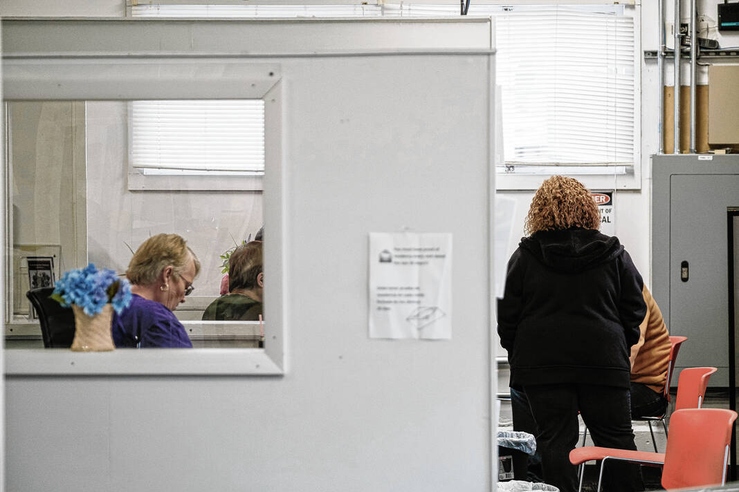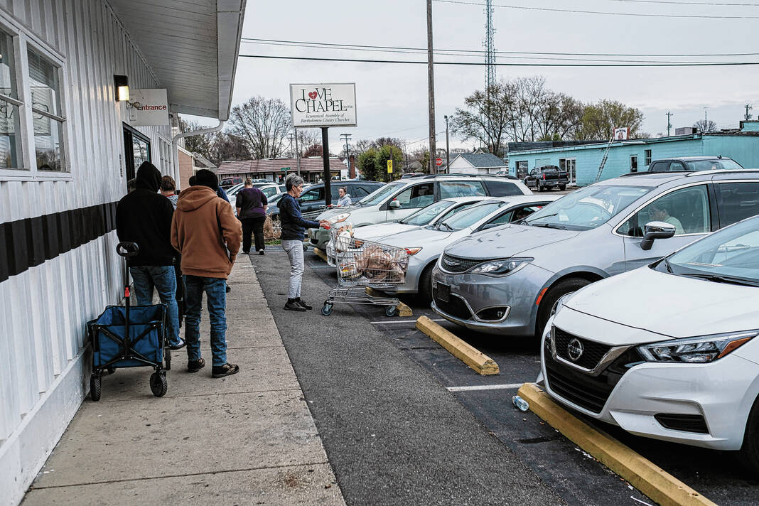 Mike Wolanin | The Republic People gather outside the Love Chapel food pantry in Columbus, Ind., Monday, Nov. 20, 2023.