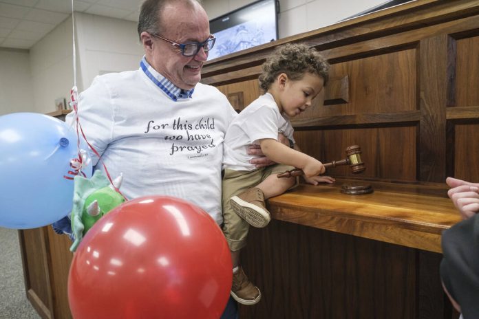 After a year-long adoption process, Charles Fugate’s prayer was answered moments after Long brought the toddler up to the bench and gave him the gavel. The second that Remy banged it, the little boy became Remington Sawyer Fugate, Charles’ son.