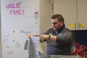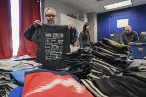 Volunteer Josh Shelley, with Horizon Bank, folds clothes at Foundation for Youth for the bank’s first ever Horizon Cares Day in Columbus, Ind., Tuesday, Nov. 28, 2023.
