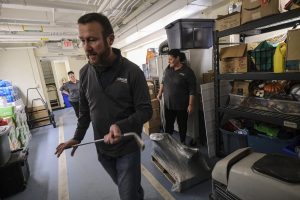 Volunteer Tim Risen and his colleagues organize a basement storage room at Foundation for Youth for the bank’s first ever Horizon Cares Day in Columbus, Ind., Tuesday, Nov. 28, 2023.