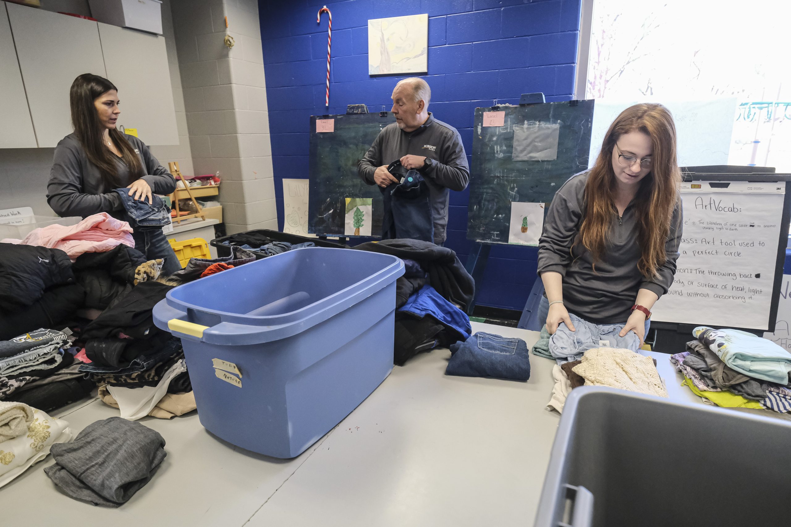 Volunteer Brandi Christian and her colleagues organize a basement storage room at Foundation for Youth for the bank’s first ever Horizon Cares Day in Columbus, Ind., Tuesday, Nov. 28, 2023.
