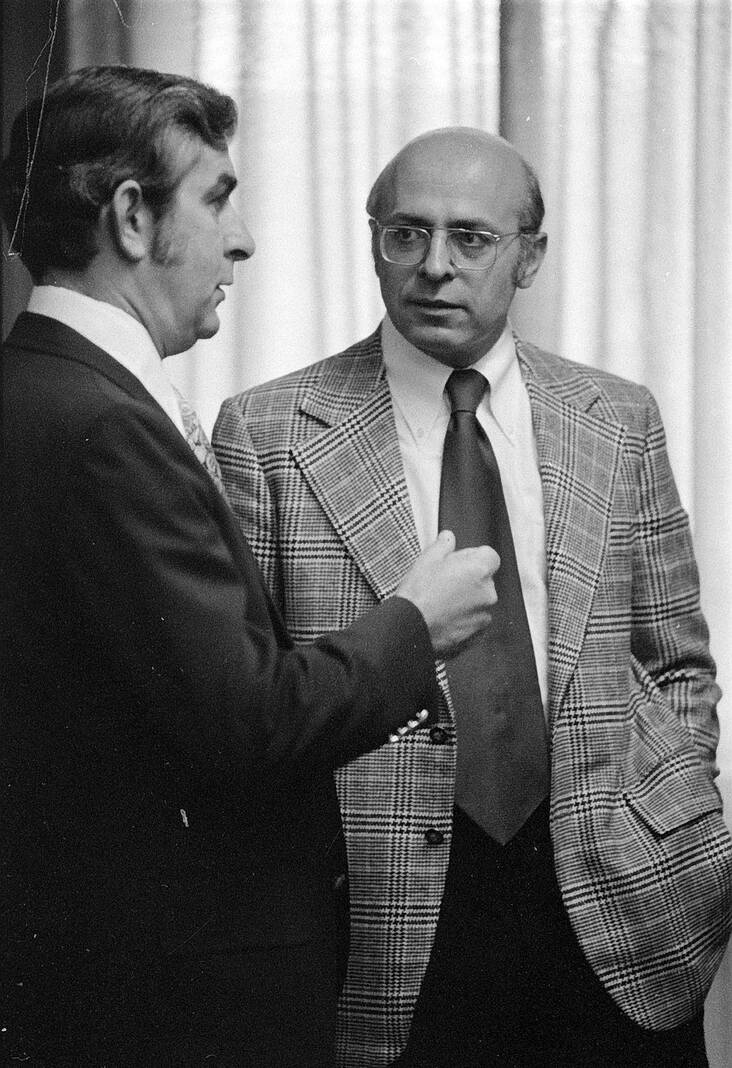 Laurence Alexander, right, head of a firm coordinating the development of downtown Columbus, talks with Carl Miske, chairman of the mayor’s task force on total downtown development, prior to a morning meeting at city hall in 1973.