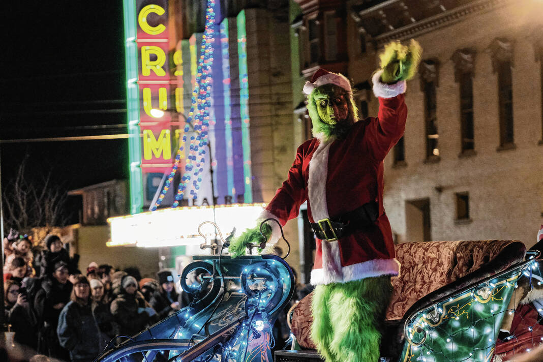 Mike Wolanin | The Republic The Grinch waves to spectators as he rides a sleigh through the intersection of Third and Washington streets during the 30th annual Festival of Lights parade in Columbus, Ind., Saturday, Dec. 4, 2021.