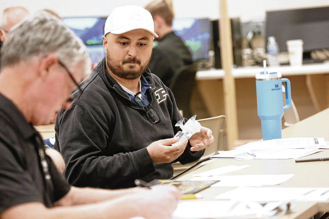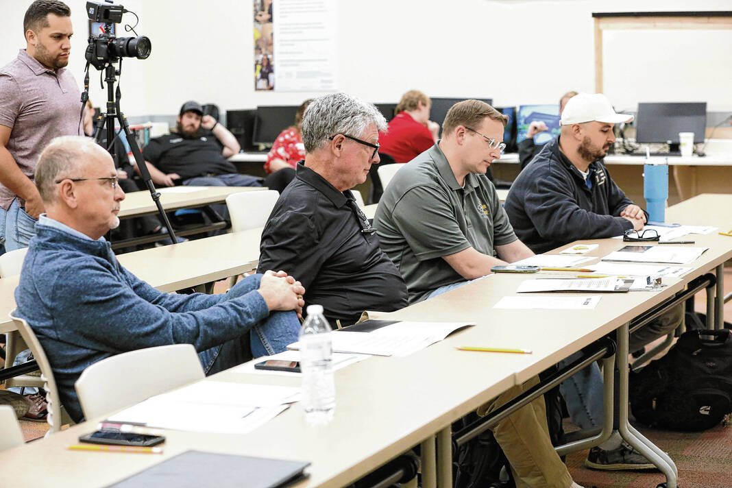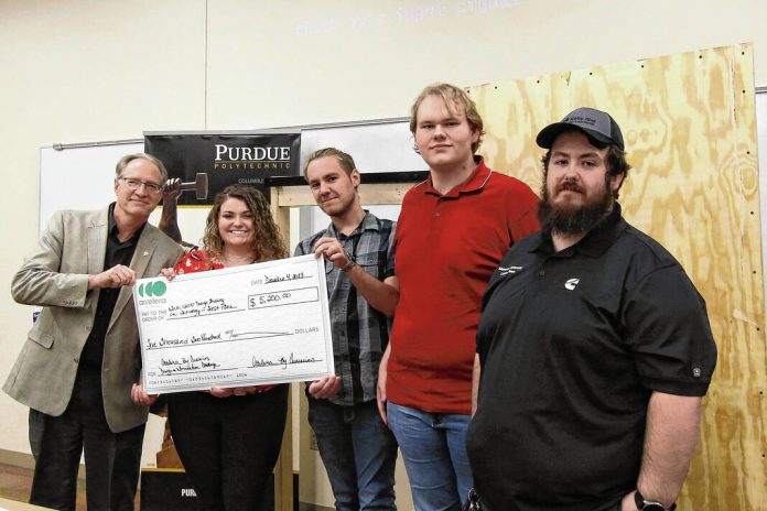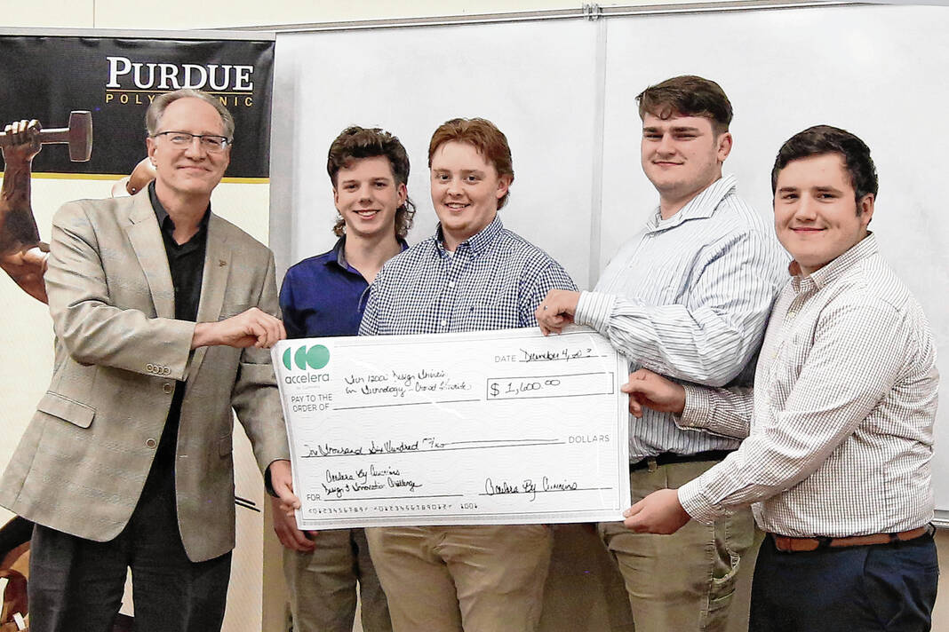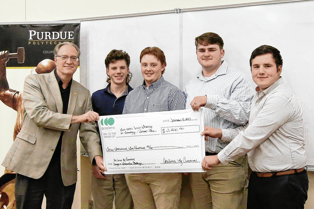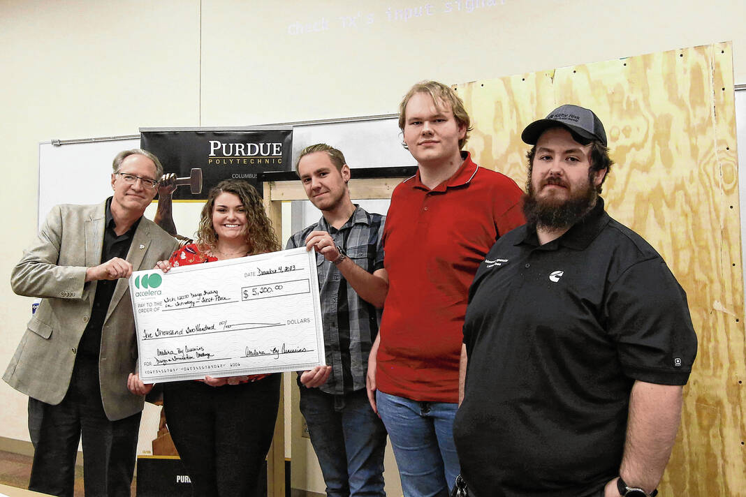 Carla Clark | For The Republic John Heichelbech, at left, presents the First Prize Scholarship check to Alexis Striecker, Luca Young, Zackary Dickman and Ryan O’Neal for their School Safety project during the Accelera by Cummins Design and Innovation Challenge, featuring students from the Purdue University Polytechnic Institute of Columbus, held at Advanced Manufacturing Center of Excellence, Columbus, Ind., Monday, December 4, 2023.