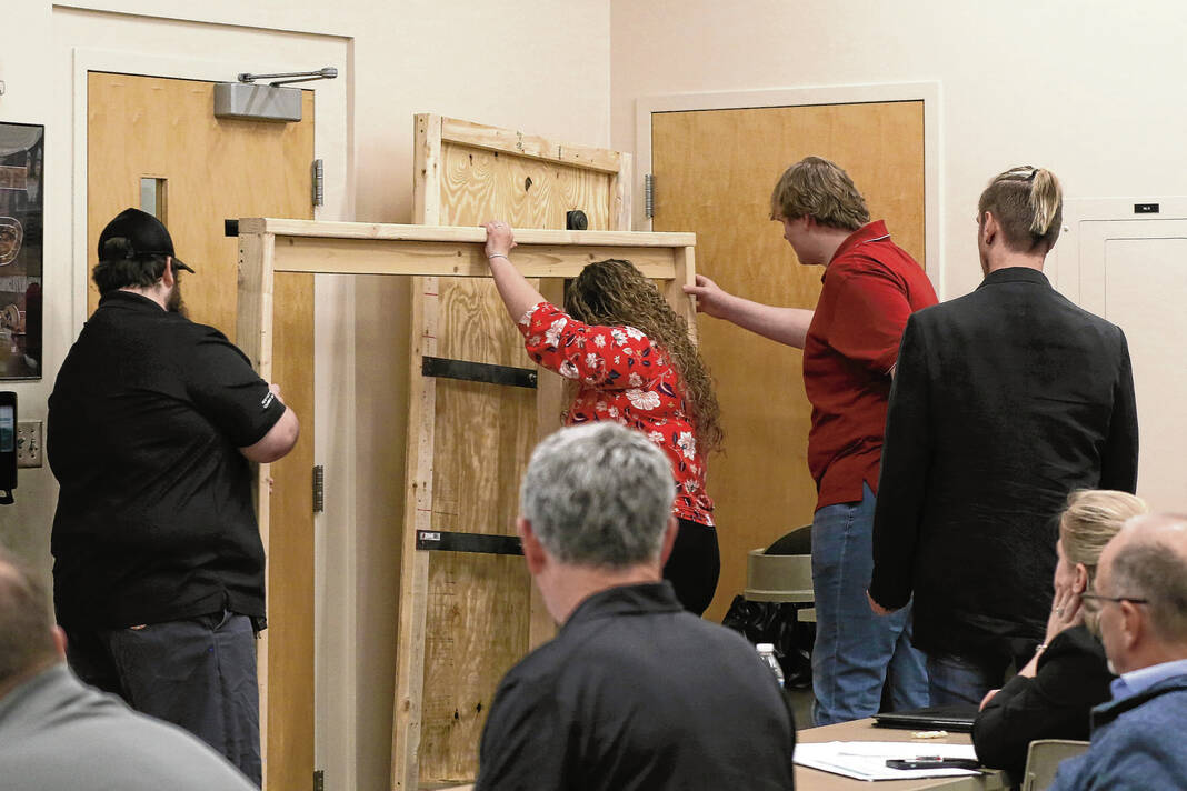 “The team’s first prototype, developed in a collaborative effort, featured a 5’x6’ rectangular frame with a sliding door mechanism, aiming to test the feasibility of sealing and securing existing doors in emergency situations,” she said.