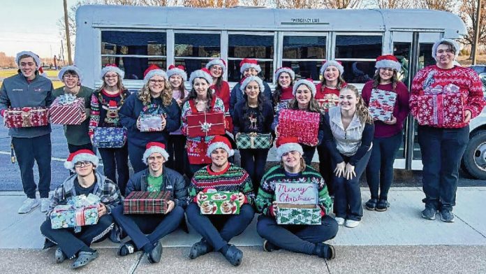 Jennings County High School’s A Touch of Class choir students pose for a photo outside of Brush Creek Elementary School on the first day of their recent holiday tour.