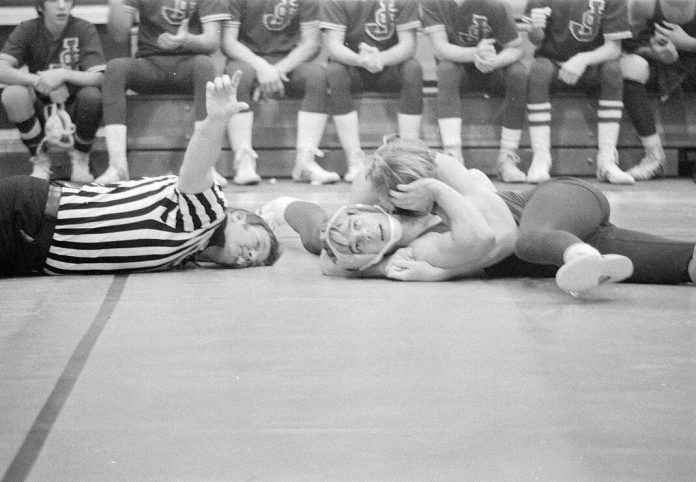 The referee signals that a pin is near but Columbus East wrestler Gary Bush, on the bottom, won a decision from Jennings County’s Tim Shepherd, on top, in 1973.