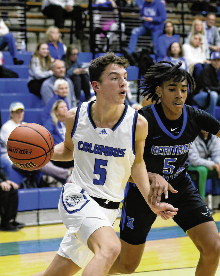 Columbus North’s Caleb Ferguson drives against Heritage Christian Nov. 21 at Columbus North.
