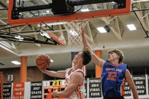 Columbus East’s Carter Patterson, left, shoots a layup under pressure from Whiteland’s Ethan Edwards Nov. 28 at Columbus East.