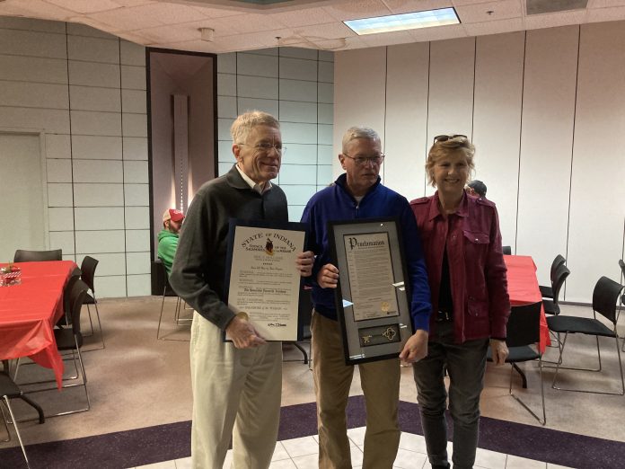 COLUMBUS, Ind. — Columbus Mayor Jim Lienhoop, who is retiring and leaving office at the end of the year after serving two terms, was honored Friday by Gov. Eric Holcomb with a Sagamore of the Wabash award.