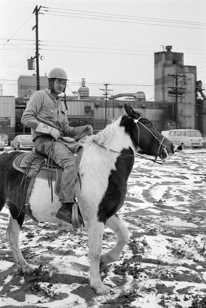 George White, an employee at Golden Foundry, rides his horse Betsy around the Golden parking lot after riding her to work from his home near Ogilville on Dec. 18, 1973.