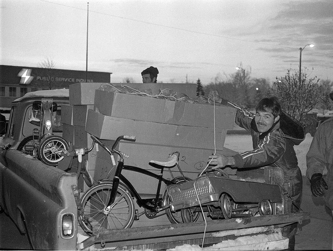 Fireman Gerald Byrne ties down a truckload of gifts as Cheer Fund volunteers start deliveries on Dec. 22, 1973.
