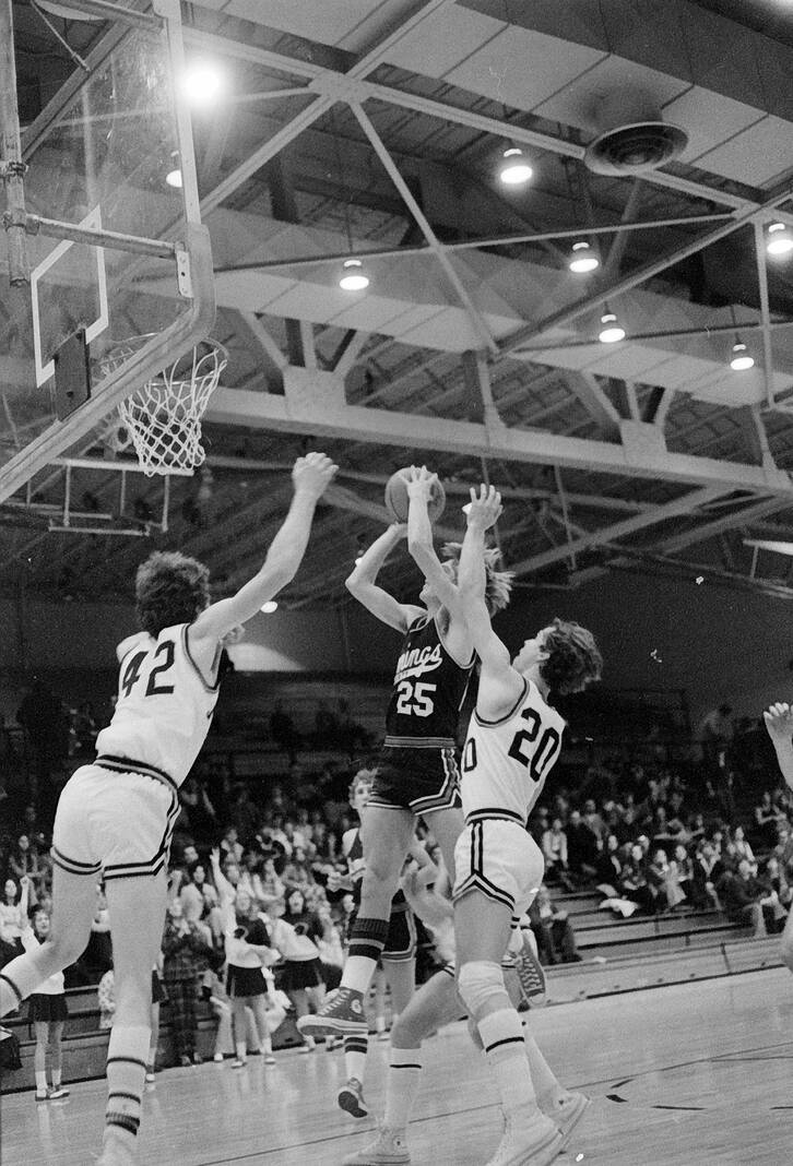Jennings County guard Rusty Sanders goes between two Noblesville players to get off this shot in the opening game of the Noblesville tourney on Dec. 29, 1973.