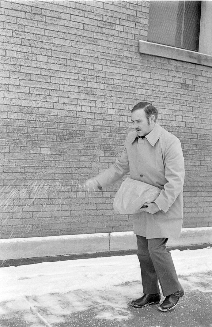 Max Carothers, owner of Max’s Jewelry at 401 Washington St., formerly Fischvogt Jewelers, sprinkles salt along the sidewalk by his store after he shoveled a walking path for passerby on Dec. 31, 1973.