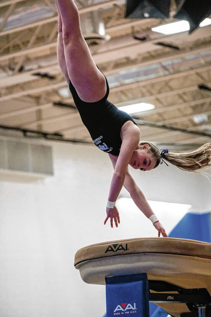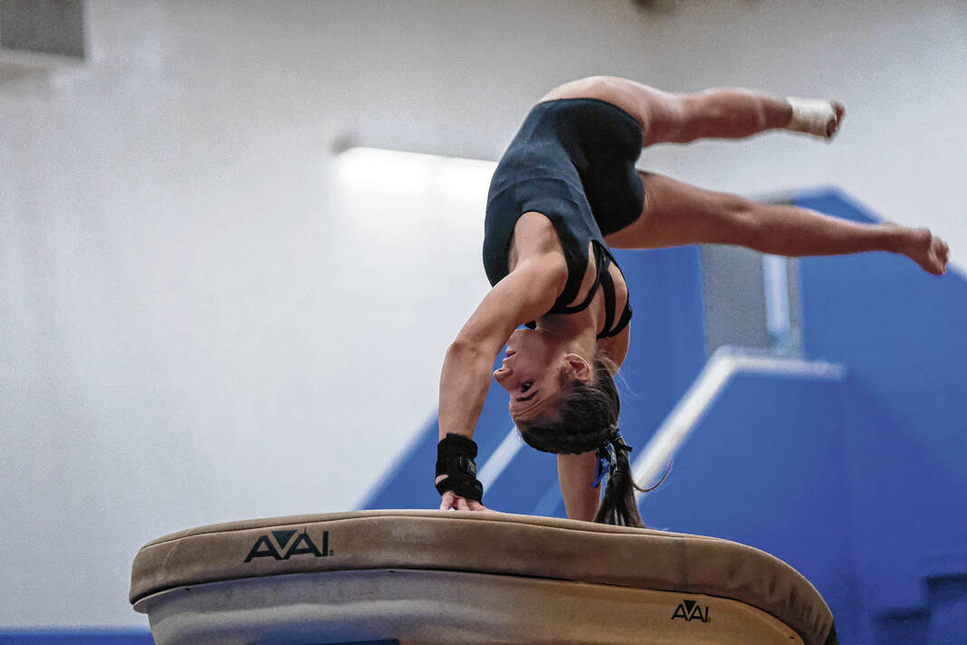 Columbus North’s Reese Euler competes on the vault during a gymnastics meet against Franklin Central at Columbus North High School in Columbus, Ind., Wednesday, Jan. 2, 2024.