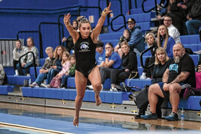 North’s Hannah Perry won the floor (9.0). She also finished third on the bars (7.875) and beam (8.625) and fourth on the vault (8.6) on her way to a third-place all-around finish with a 34.1.