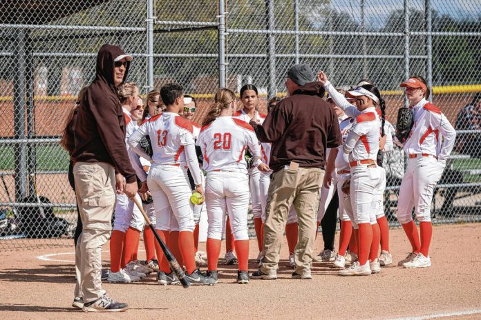 Members of the Columbus East softball team huddle with head coach Rusty Brummett before their game against crosstown rival Columbus North at Columbus East High School in Columbus, Ind., Monday, April 17, 2023. The Olympians will host this year’s sectional on its new field.