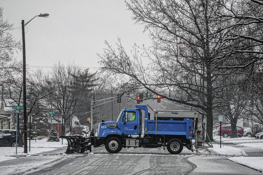 Mike Wolanin | The Republic A snow plow crosses Home Avenue in Columbus, Ind., Wednesday, Jan. 25, 2023.
