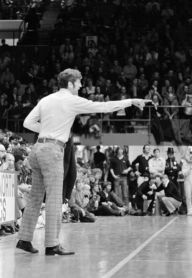 As the action in the Columbus North holiday basketball tournament heats up, Columbus East Coach Lou Giovanini sheds his sport coat, and then with jacket in hand, gives directions to his players on the floor in 1974.
