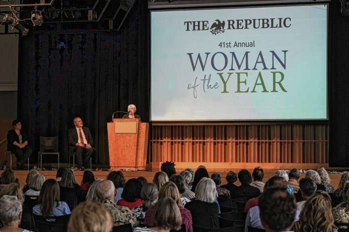 Janice Montgomery thanks her family, friends and supporters in a speech after receiving The Republic’s 2023 Woman of the Year award last June. Nominations are being accepted for the 2024 honor.
