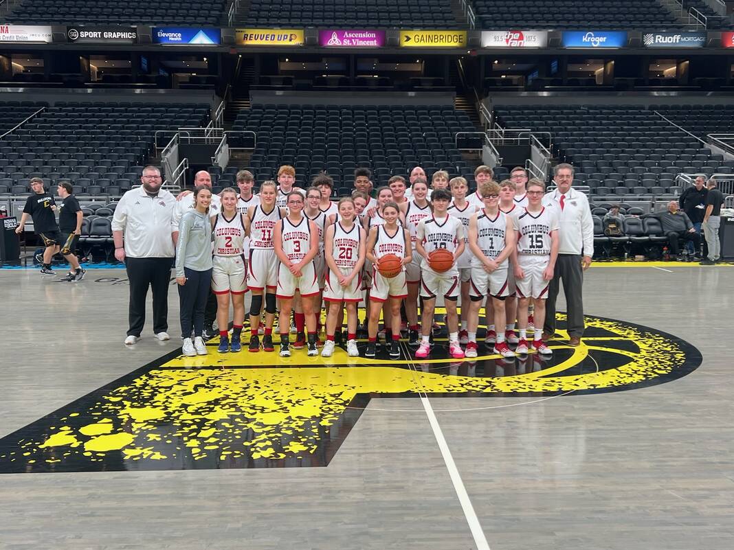 The Columbus Christian boys and girls basketball teams pose for a photo late Saturday night at Gainbridge Fieldhouse after their girls game and before the boys game against Cannelton.