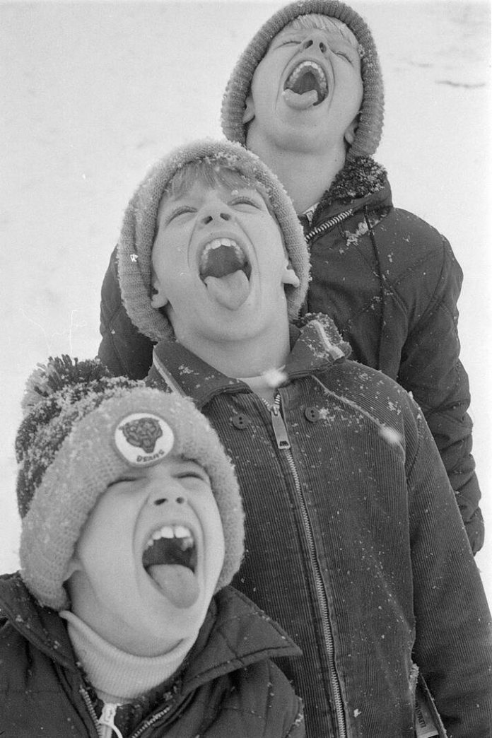 Andy Pierce and Greg and Steve Hundley, front to back, have apparently developed a taste for snowy weather, and attempt to catch a few flakes on their tongues after school on Jan. 9, 1974.