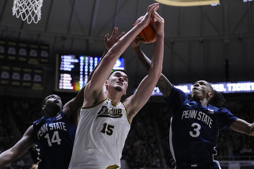 Purdue center Zach Edey (15) grabs a rebound between Penn State forward Demetrius Lilley (14) and guard Nick Kern Jr. (3) during the second half of an NCAA college basketball game in West Lafayette, Ind., Saturday, Jan. 13, 2024. (AP Photo/Michael Conroy)