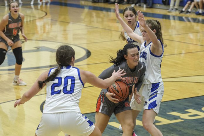 Columbus East’s Madelyn Poe, center, drives to the basket between Columbus North’s Kaylie Harmon, left, and Kaitlin White, right, during the annual crosstown rivalry game at Columbus North High School in Columbus, Ind., Thursday, Dec. 14, 2023.