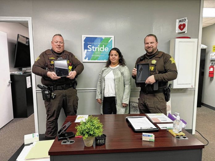 Photo provided Deputy Ryan Smith, left, and Sgt. Andrew Whipker, right, are shown with iPads to be used for help on calls involving individuals in a mental health crisis, provided in a partnership with Stride, represented by Melissa Helm.