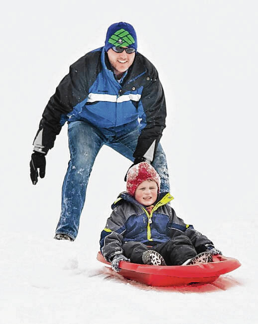 Chris Rich gives his son Aiden, 6, a push on the hill at Mill Race Park in 2014.