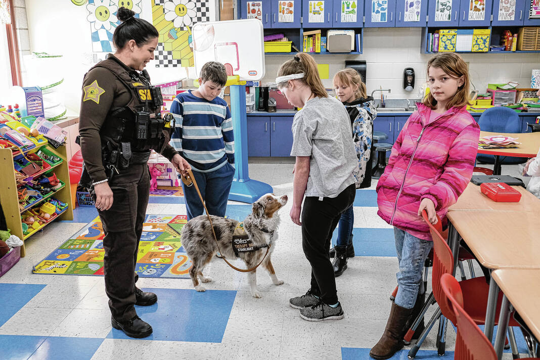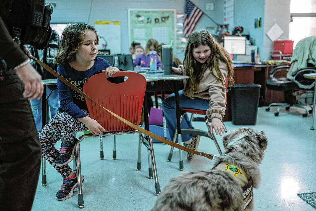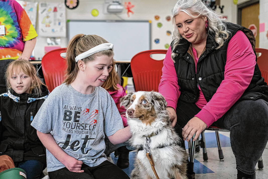 Mike Wolanin | The Republic Third graders Audrianna Adams, left, and Kinley Hartwell reach out to pet therapy dog Starlight at Hope Elementary School in Hope, Ind., Thursday, Feb. 1, 2024.