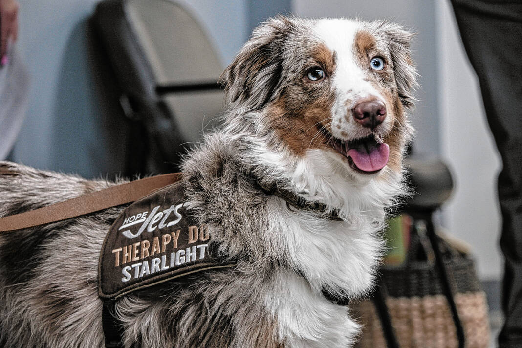 Starlight the therapy dog, a 3-year-old miniature Australian Shepherd with one brown and one blue eye, just finished her first semester of work and has proven to be an asset, wagging through the halls and uplifting the spirits of all who come in her path, students and staff say. Students’ faces light up when they catch a glimpse of her.