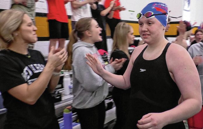Jennings County High School senior Avery Witt approaches the starting block at the Floyd Central girls swimming sectional, where last week she set a school and personal record time in the 100-meter backstroke. Witt is competing in the state meet this weekend.