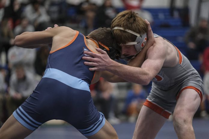 Columbus East’s Talon Jessup, in orange, wrestles Switzerland County’s Ethan Rose for the 106-pound sectional title at Jennings County High School in North Vernon, Ind., Saturday, Jan. 27, 2024. Jessup defeated Rose to win the title.