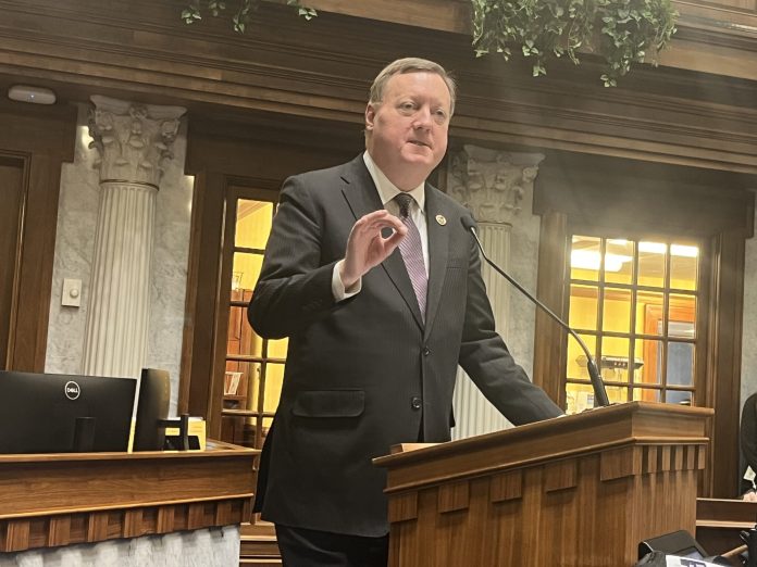 Sen. Eric Koch, R-Bedford, shares the details of his lead service pipe upgrades bill on Jan. 11, 2024. (Whitney Downard/Indiana Capital Chronicle)
