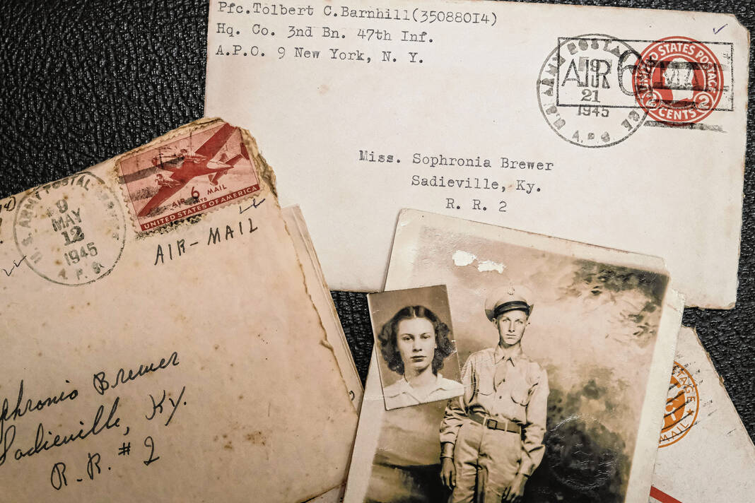 Romantic love bloomed for many in the grim, hardened soil of World War II. That included Terri Metz’s great uncle and great aunt, U.S. Army Private First Class Tolbert Barnhill and Sophronia Brewer, two eastern Kentucky natives who felt romance spark as teens just before he shipped to Germany’s front lines as a tender-faced 19-year-old to serve in 1944.