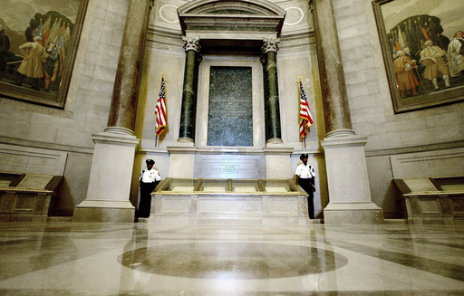 WASHINGTON (AP) — The National Archives building and galleries were evacuated Wednesday afternoon after two protesters dumped red powder on the protective case around the U.S. Constitution.