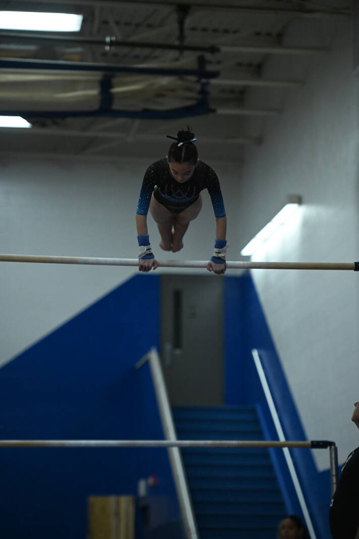 Columbus North’s Laney Acton competes on the bars against Owen Valley at Columbus North High School, in Columbus, Ind., Thursday, February 15, 2024.