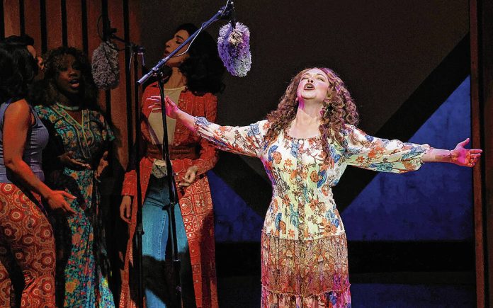 Devon Perry sings as pop star Carole King in a scene from the production of “Beautiful: The Carole King Musical” at Beef & Boards Dinner Theater in Indianapolis.