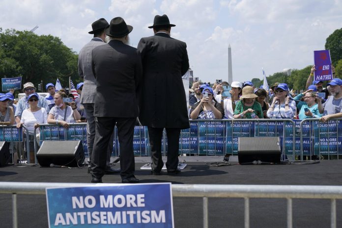 People attend the “No Fear: Rally in Solidarity with the Jewish People” event in Washington on July 11, 2021. A survey released this month found nearly two-thirds of American Jews feel less secure in the U.S. than they did a year ago.