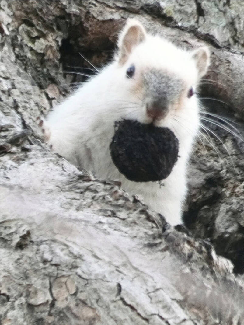 Audrey McFarlane, of Jonesville, captured this shot of an albino squirrel with an unshelled walnut in his mouth.