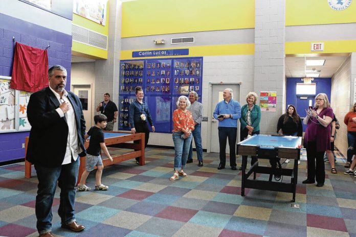Andy Young, at left, speaks during the presentation Eugene M. Gurthet Gamesroom plaque during the Foundation For Youth annual meeting, at the Foundation for Youth facility, Columbus, Ind., Tuesday, April 4, 2023. Carla Clark | For The Republic
