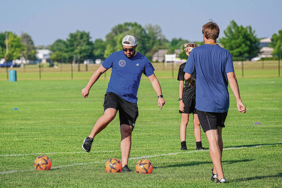 Sam LaVelle, left, coach of the Columbus Express 08 Boys Orange team, sets up soccer balls for a possession and passing drill during practice June 30, 2022, at the Richard Wigh Soccer Complex in preparation for the US Youth Soccer National Presidents Cup.